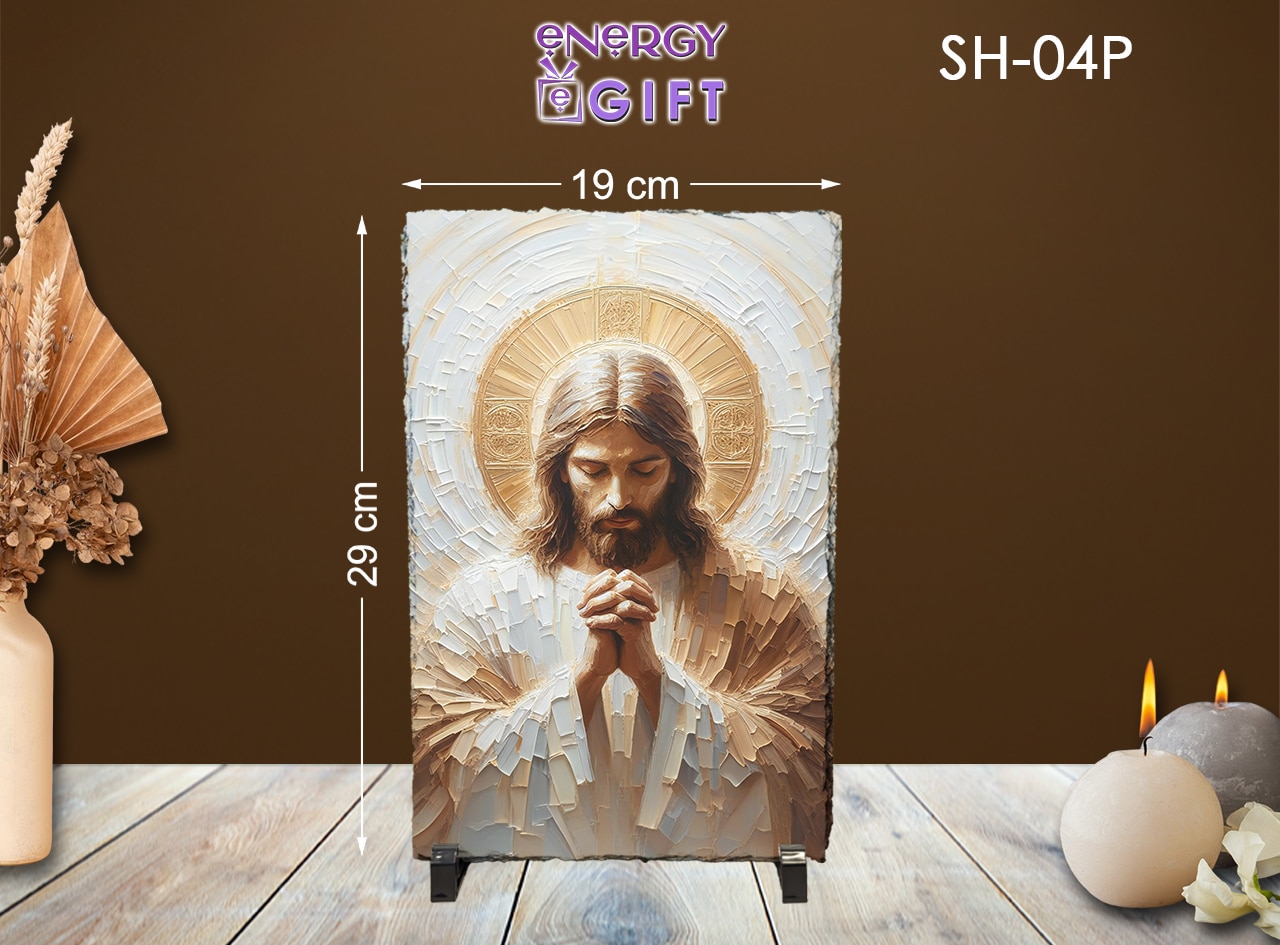 Modelul Tablou Piatra Religios #23 surprinde chipul lui Iisus într-o reprezentare expresivă, plină de emoție. Fiecare bucată de piatră este unică, iar imprimarea UV color garantează culori intense și detalii clare.